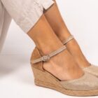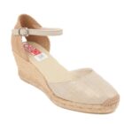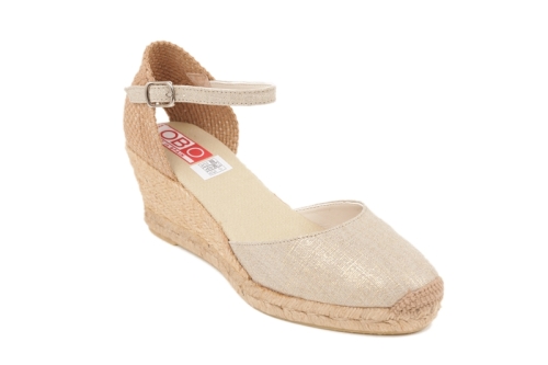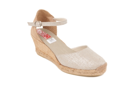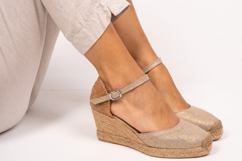 Cosido exterior en la puntera, forrada con plantilla de tela y cuña oscurecida en tostado.