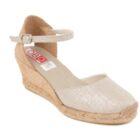 Alpargata de yute de cuña alta en tela de lino con pulsera al tobillo y talonera de tela de saco.