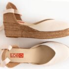 Alpargata de yute de cuña media con empeine escotado en V y cintas desde la talonera.