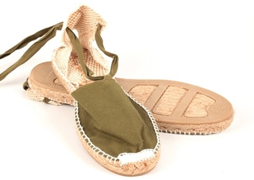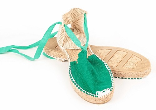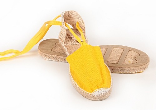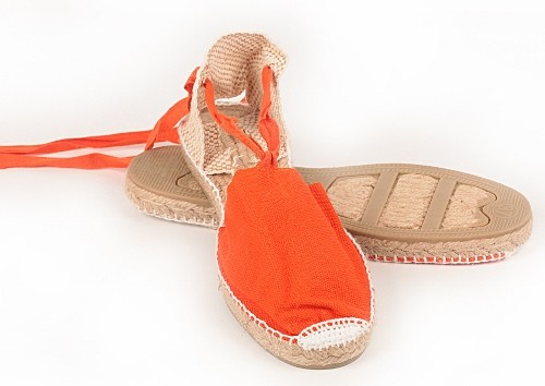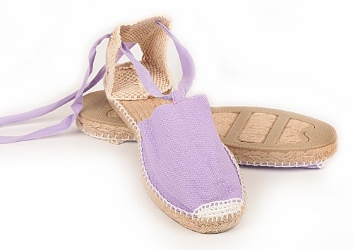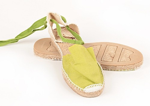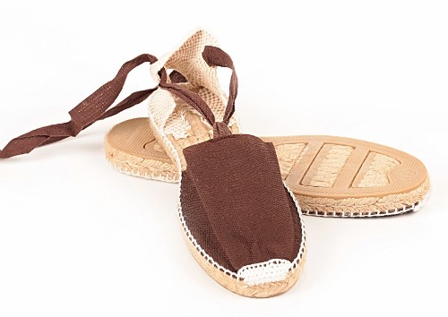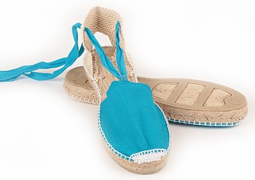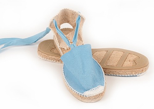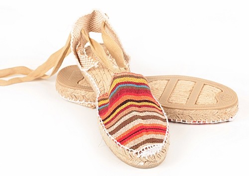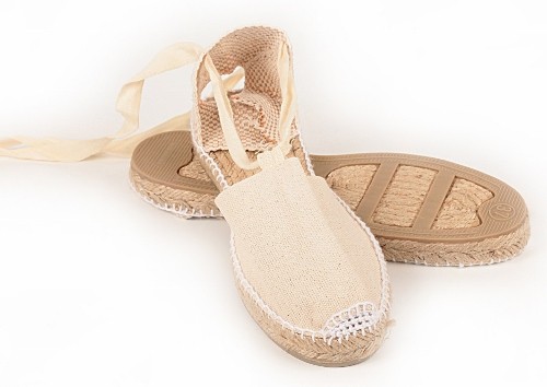 Alpargata de yute plana abierta con cintas para atar al tobillo y talonera de tela de saco. Para mujer y niño.