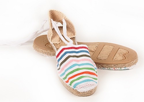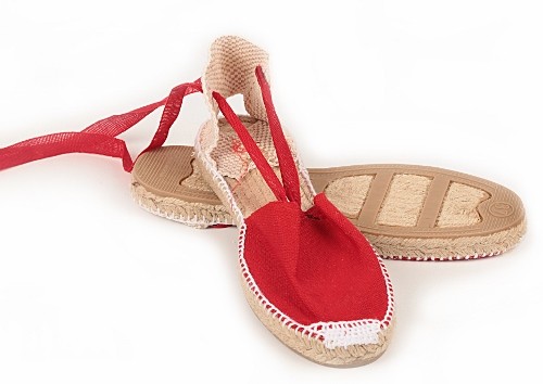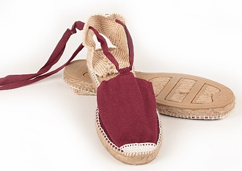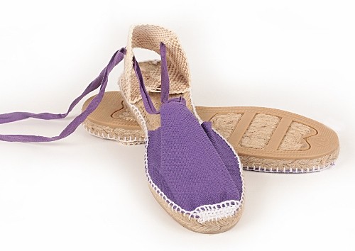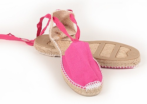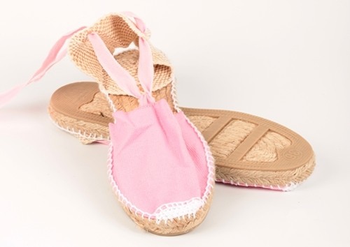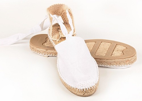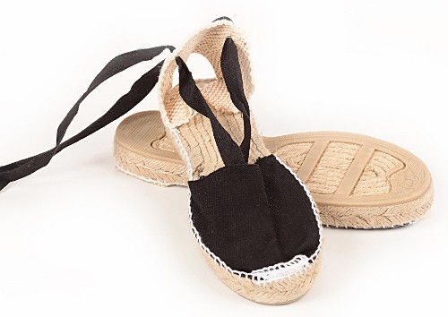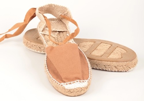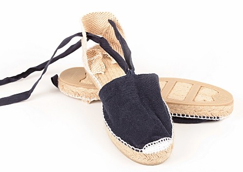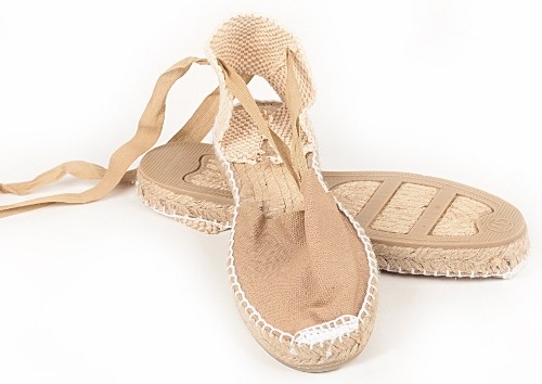 Alpargata de yute plana abierta con cintas para atar al tobillo y talonera de tela de saco. Para mujer y niño.