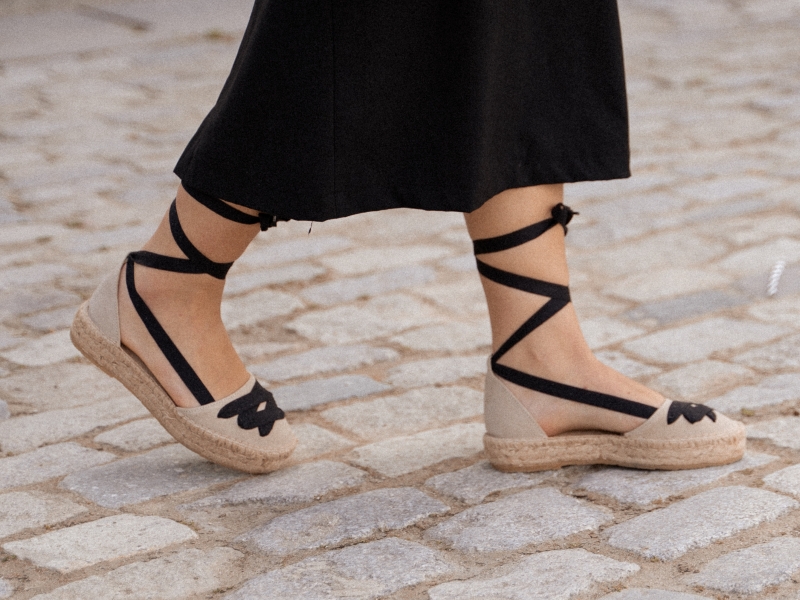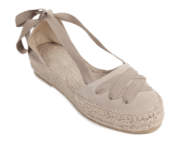 Alpargata de yute plana de doble suela, empeine de serraje en color natural y cintas en negro para atar al tobillo para mujer y niña.